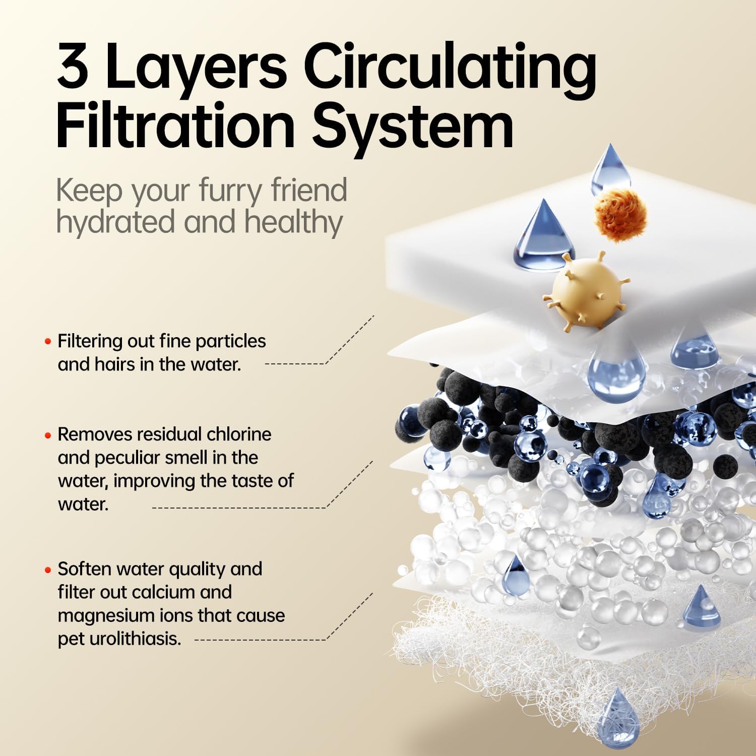 Multi-Filtration System for Fresh, Clean Water – Equipped with a multi-layer filtration system that removes hair, dirt, and impurities while reducing odors and improving water taste, keeping your pet hydrated with clean, fresh water.
