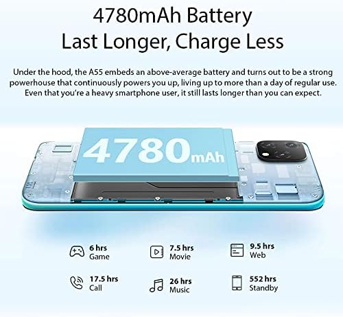 🔋【4780mAh big Battery Unlocked Smartphone Android】Blackview a55 4G smart phone packs a 4780mAh battery which guarantees a long service between charges. And with the power-efficient processor, the battery of a55 blackview cheap smartphone makes it possible for you to keep on playing hours without worrying about running out of power, battery life varies depending on the method of use.
