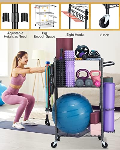 FHXZH Yoga Mat Storage Rack, Home Gym Workout Equipment Storage Rack, Cart for Organizing Workout Room, Organizer Yoga Equipment Dumbbell Kettlebells Home Gym Storage Rack with Hooks and Wheels