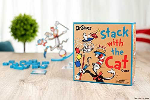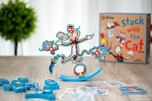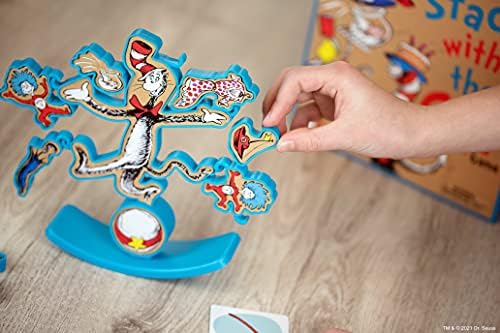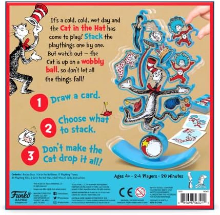It’s a cold, cold, wet day and the Cat in the Hat has come to play! Stack the playthings one by one. But watch out—the Cat is up on a wobbly ball, so don’t let all the playthings fall! Draw a card. Choose a plaything to stack on the Cat in the Hat. Be careful— don’t make the Cat drop it all!