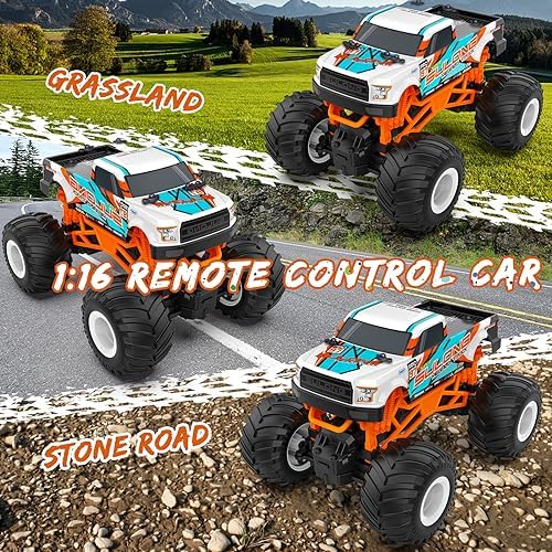 1:16 Monster Trucks: Our 1:16 scale RC cars are powered by strong magnetic motors. These remote control car speeds topping to 20km/h. Powerful Controller: A 2.4GHz radio control system provides a stable control range within 160 feet. Reliable transmission forward, brake and reverse would never fail. Anti-interference function allows multiple monster trucks to race together, suitable for 4 5 6 7 8 9 year old boys to play together. Off Road Remote Control Car: Equipped with powerful magnetic motors and high grip off-road tires. Our monster trucks for boys and girls also have a differential to make the remote control car for boys 4-7 more nimble when cornering. Whether indoors or outdoors, you can easily break through the land, stone roads, beaches and grasslands. Safety Material: Our monster trucks’ shells are made of flexible PVC to ensure the material is safe, drop resistant and durable. The battery is attached to the panel with screws, it is not easy to fall down, ensuring the safety of 3 4 5 6 7 8 9 year old boys & girls. Monster Trucks Gift for Boys and Girls: Our remote control car for boys girls 4-7 is durable, speedy, fun, and suitable for birthday parties and many occasions. Kids can harvest their unique happiness together. Great gifts for 5 6 7 8 9 10 11 12 year old boys & girls.