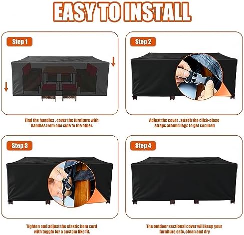 ✅【 Easy To Install 】Our cover is designed with four click-close straps and cord-lock closure at bottom to keep the cover attached to the furniture. It is convenient to install or remove the cover. 100% coverage design avoids the exposure of furniture in the sun makes your furniture always look like new. It is very easy to clean the surface dust, just wipe it with water, then dry it, do not use strong detergent or put it in the washing machine.