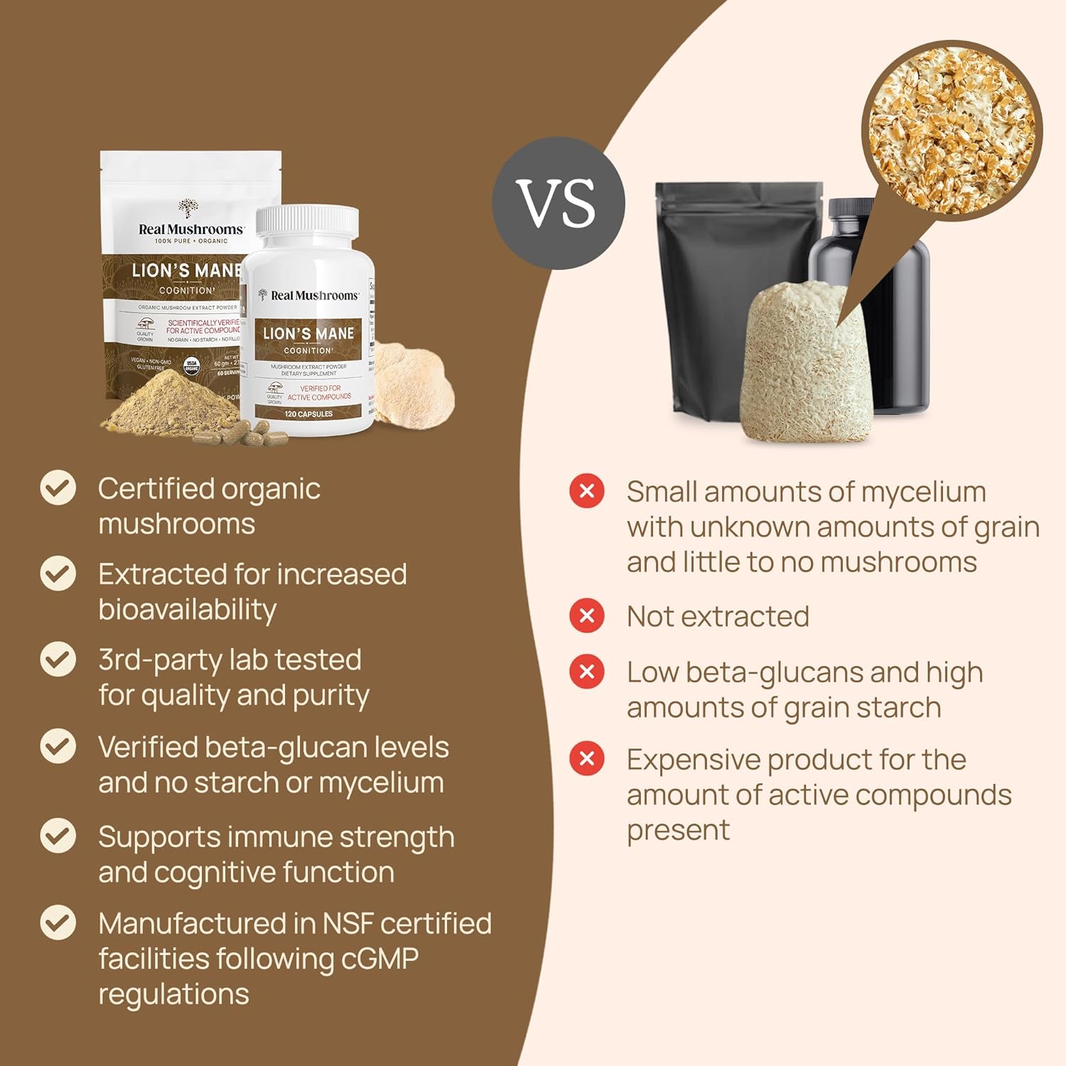 Organic Mushroom Extract: Our mushroom capsules are only made from 100% mushrooms (fruiting bodies), not mycelium grown on grain like most brands. Contains no starch, grains, or mycelium