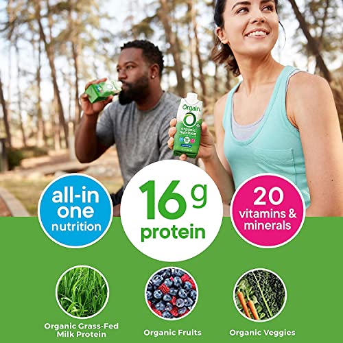 16 grams of organic protein (from organic whey protein concentrate and organic grass fed milk protein concentrate), 2 grams of dietary fiber, 20 vitamins and minerals, 10 fruits and vegetables (including acai, spinach, kale), 250 calories per serving