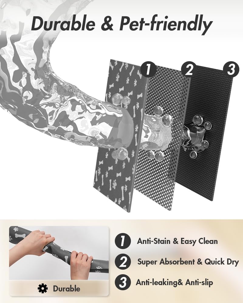 Absorbent & No Stains: Perfect dog accessories.This dog food mat can stop water from overflowing. Super absorbent and quick-dry ability can avoid wetting pet paws even for messy drinkers. No marks will be left when food and water are dropped on the pet food mat. keep any pet owner floors clean and dry while also ensuring that their pet’s feeding area is comfortable and safe.