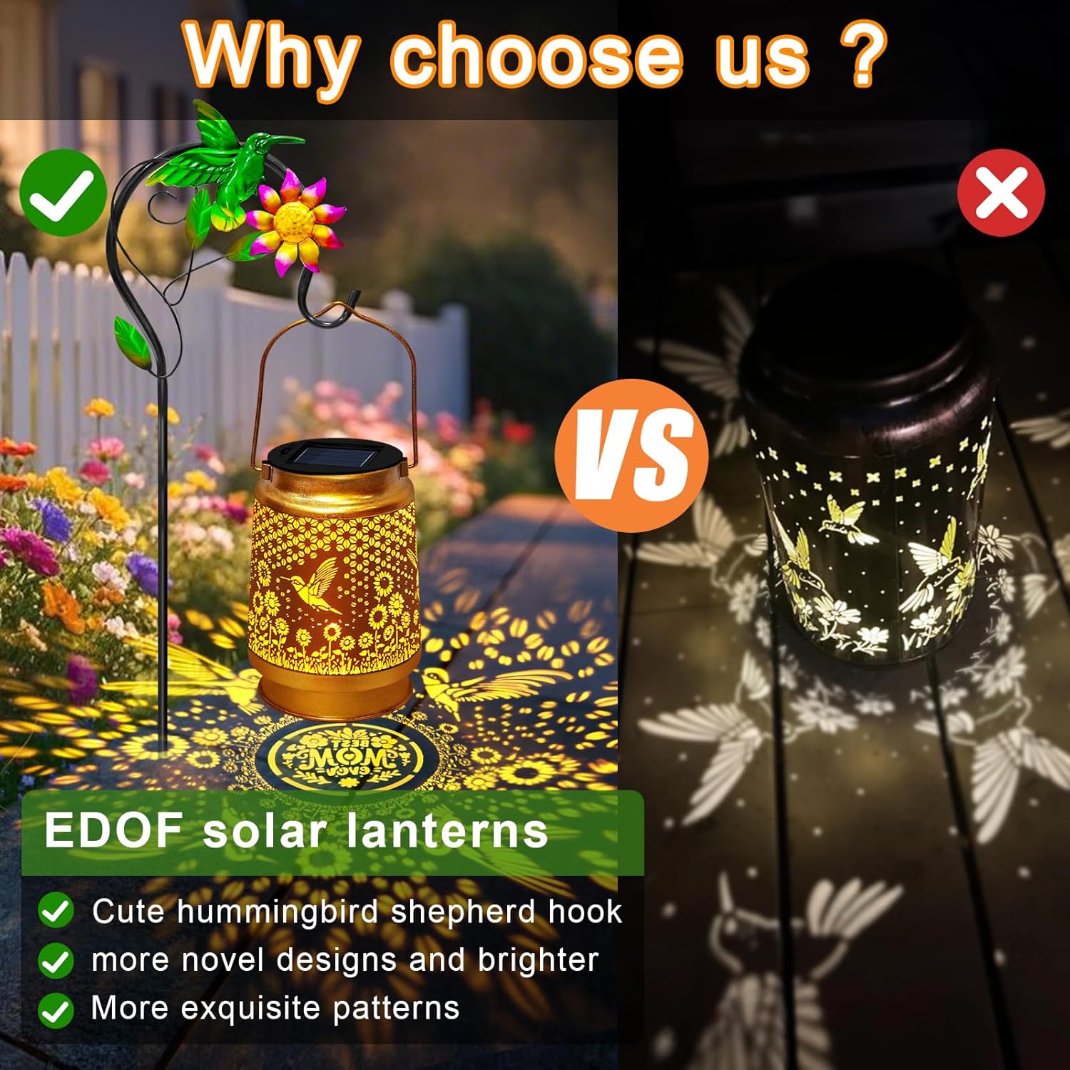 EDOF solar outdoor lanterns with this good lighting,beautiful pattern projection,solar outdoor lights is a surprising yard outdoor decorations to decorate your garden,patio,porch,pathway,walkway,lawn,tree;solar hummingbird lights with the bottom projection “mom” is a unique garden hummingbird gifts.