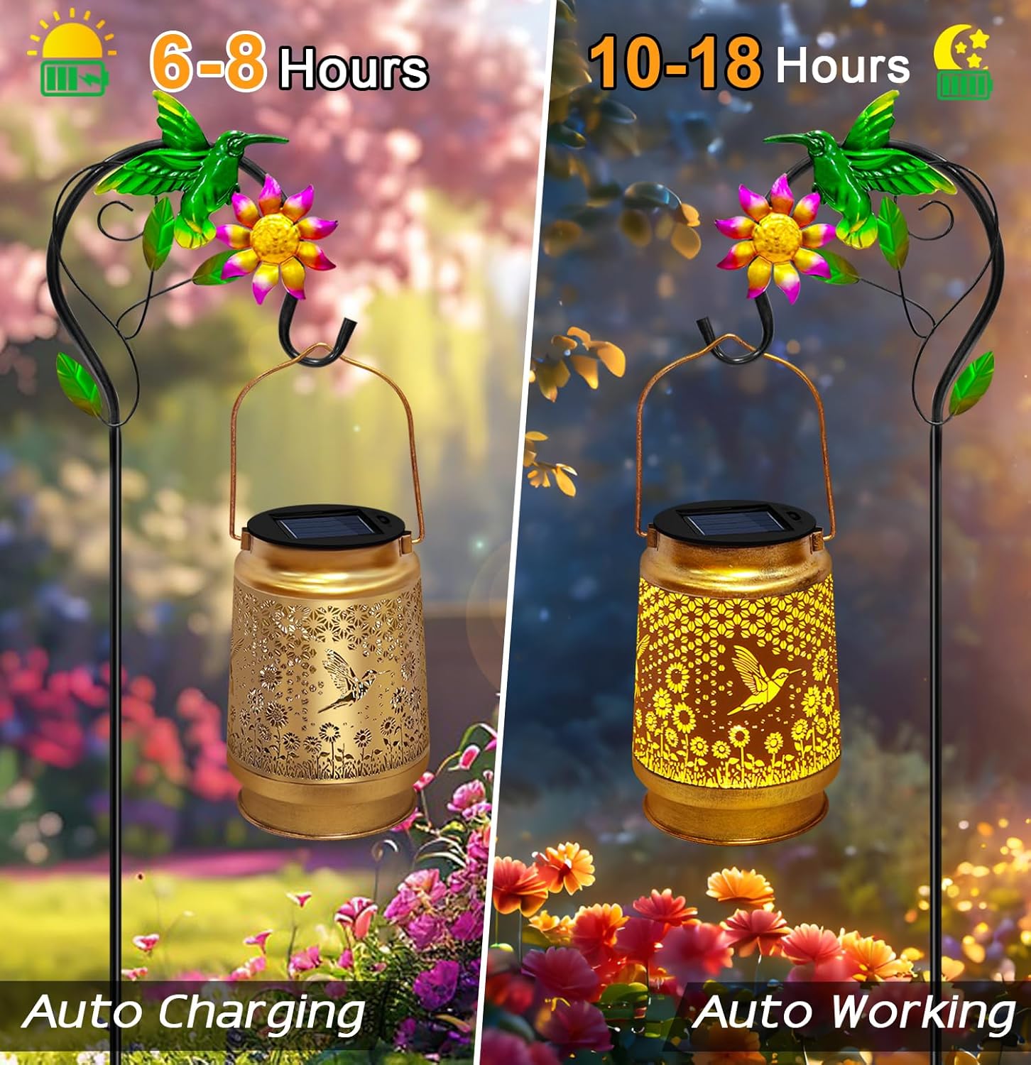 Hummingbird Lanterns Come with Shepherd Hook:Unlike other solar lantern,our solar outdoor lanterns comes with a beautiful decorative 33-inch shepherd’s hook,which makes it easy to hanging solar lantern in outdoor spaces;EDOF’s new solar lanterns have a retro appearance,with gold copper and hollowed-out metal veneer,Carved with delicate hummingbird and sunflower decorations,outdoor decorative lanterns cast bright and warm light in the dark,accompanied by flying hummingbirds and sunflower flowers lights,adding to the pleasant atmosphere of the surrounding environment.