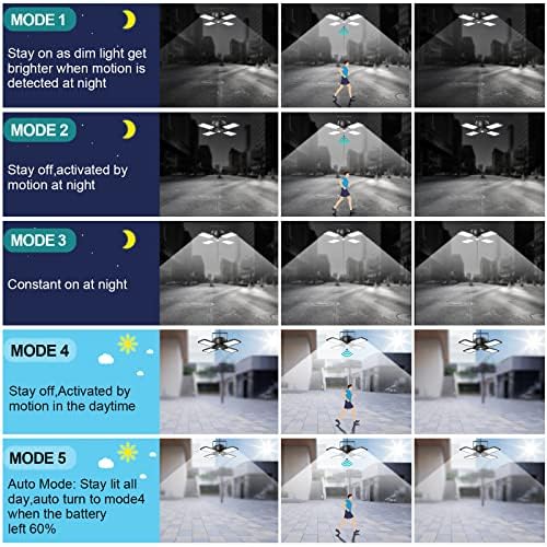 【5000mAh Large Capacity, Efficient and Durable】The indoor solar garage light has a large capacity of 5000mAh, and solar powered outdoor lights can be fully charged within 6-8 hours, and deliver 10-12 hrs lighting. We also added a battery reminder and mode switching button on the motion sensor outdoor lights body, which is convenient for you to track the current remaining battery power, which is more convenient to use. Note: Before installation and use, please charge the outdoor lights solar powered for 6-8 hours in the sun, and turn on the power button next to the motion sensor when you use it for the first time.