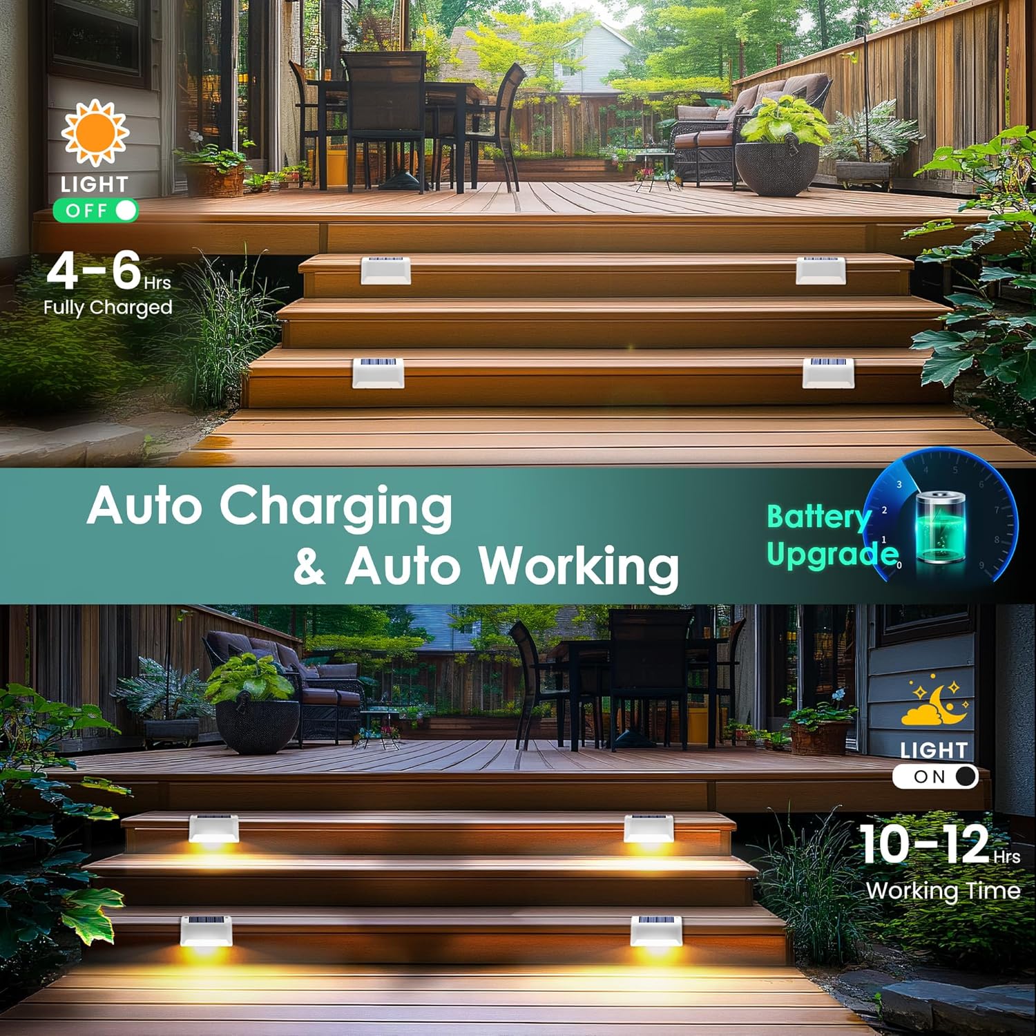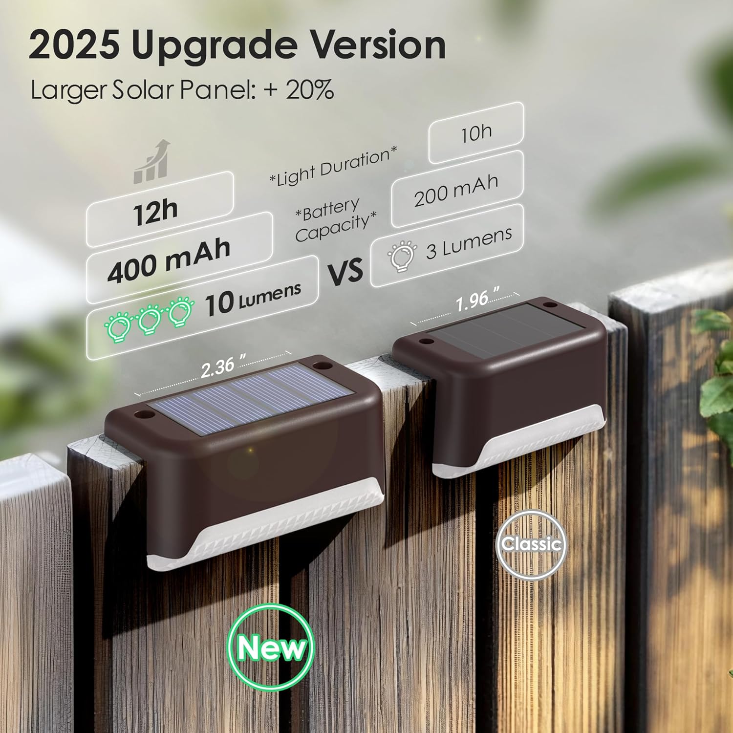 𝟐𝟎𝟐𝟓 𝐔𝐩𝐠𝐫𝐚𝐝𝐞𝐝 𝐒𝐨𝐥𝐚𝐫 𝐃𝐞𝐜𝐤 𝐋𝐢𝐠𝐡𝐭𝐬: Upgraded to 10 lumens, these solar step lights provide brighter, softer lighting for your fence, patio, stairs, railing or balcony. Create a cozy and inviting atmosphere for your outdoor space