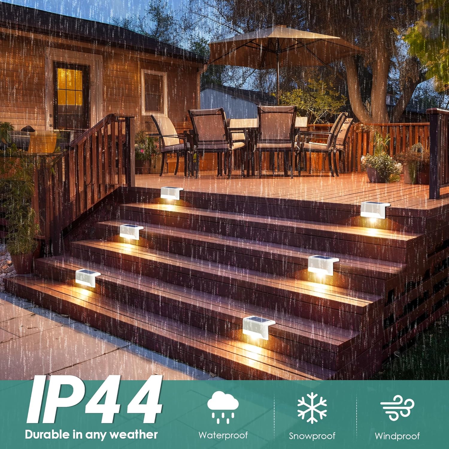 𝐖𝐢𝐝𝐞𝐬𝐩𝐫𝐞𝐚𝐝 𝐔𝐬𝐞 & 𝐈𝐏𝟒𝟒 𝐖𝐚𝐭𝐞𝐫𝐩𝐫𝐨𝐨𝐟: Built to withstand wind, rain and light snow, these solar backyard lights are perfect for balcony, terrace, staircase and railing lighting. Their IP44 waterproof rating ensures long-lasting performance in all weather conditions