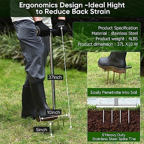 【Heavy Duty and Ergonomics Design】Our manual lawn aerators are made from top-quality stainless steel,which is both anti-corrosion and anti-rust.The welding workmanship is of exceptional quality. At 37 inches long,it’s the perfect height to reduce back pain, and with 4 piece 5 inch solid stainless steel spike tines,you’ll easily get the job done.