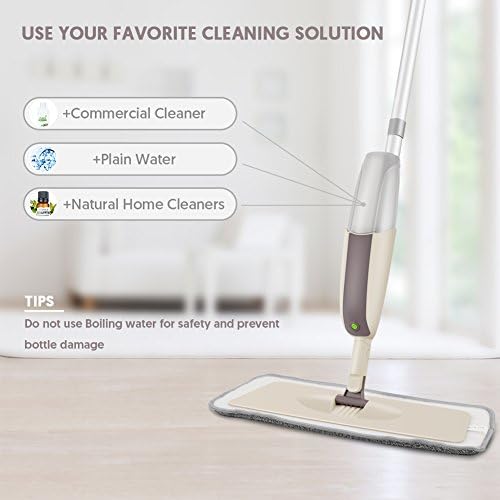 【Cleaning Solution Options】The refillable bottle allows you to choose the best cleaning solution for your needs, like: water, a diluted cleaning solution, or a major brand floor cleaner. Most cleaning solutions are available to be added in the water bottle, except strong acid and boiling water. By the way, please cleaning the water bottle everytime after finished the mopping as it is helpful to prolong the lifetime of your spray floor mop.