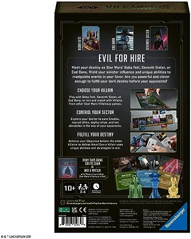 “Meet your destiny as Star Wars’ Boba Fett, Seventh Sister, or Cad Bane in this strategy card game. Wield your sinister influence and unique abilities to manipulate events in your favor. Are you powerful and clever enough to fulfill your dark destiny before your opponents? To win as Boba Fett, players must complete 4 Bounties to maintain his place as the Galactic Empire’s greatest Bounty Hunter. Seventh Sister must remove the three Rebel Heroes – Ahsoka Tano, Kanan Jarrus, and Ezra Bridger – from the game. Cad Bane must collect 5 Target tokens by defeating Heroes that have Targets placed on them by his Allies. Star Wars Villainous: Scum and Villainy can be combined with other Star Wars Villainous titles to support games of up to four players. Experience your favorite Villain’s story! Players take on the role of a Star Wars Villain and work towards a unique objective, fighting off iconic Star Wars Heroes as they deal twists of fate to their opponents. The first Villain to complete their objective wins. Ages: 10+ Players: 2-4 Playing Time: 20 minutes per player “