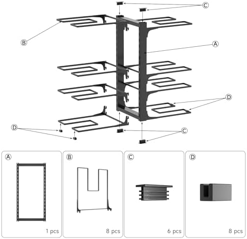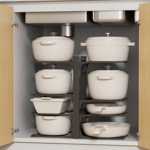 ⭐【Effortless Installation】Our pot organizer rack for under cabinet is designed for easy installation. No need for tools, you can have it assembled in just minutes. Plus, you can customize the height to suit your preferences. For step-by-step installation guidance, check out our instructional video in the listing.