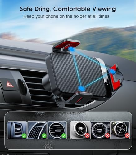 【Stable & Flexible Viewing Angle】This carbon fiber car wireless charger with a 360-degree rotating and pivoting ball joint can help you get the most comfortable and safest viewing without neck or eye strain while charging your phone.(Please NOTICE that some Air Vent outlet not compatible)