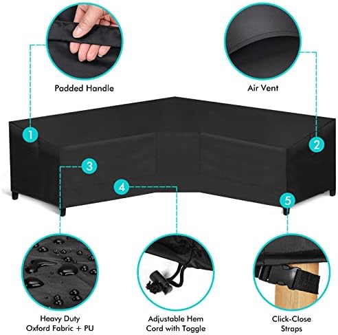 WINDPROOHANDLES AND AIR VENT: Durable padded handles make it easier to install and remove. Air vent can reduce condensation and provide maximum ventilation.F PATIO SECTIONAL COVER: 6 Solid click-close straps and Snug-fitting drawstring at them with adjustable toggle fit with exceptional security in the windiest conditions.
