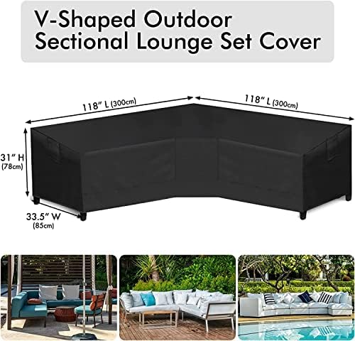 OUTDOOR SECTIONAL COVER SIZE: Measured with 118″ L (on Each Side) x 33.5″ D x 31″ H, perfectly fit for most V-shaped sectional lounge sets. But please measure your sofa carefully before purchasing.
