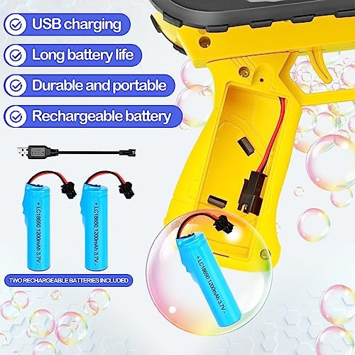 【High-Capacity Rechargeable Battery】This bubble gun is equipped with two rechargeable batteries(TWO RECHARGEABLE BATTERIES INCLUDED), which can be used multiple times after charging once. This bubble machine has super endurance, strong power, easy to carry and simple operation. Just press the trigger and it will automatically blow out countless colorful bubbles.